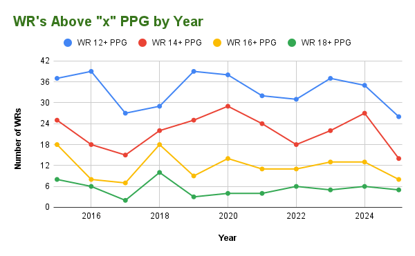 But before we close, I want to leave you with the inverse effect this is having on receivers. Here is a chart of WRs in that same time period, grouped into 12, 14, 16, and 18+ FPPG, essentially, from WR3s up to the elite WR1s.